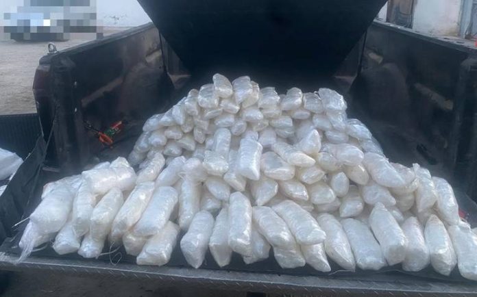 Elementos de la Secretaría de Marina Armada de México, aseguraron por la zona de Cerritos en Mazatlán 100 kilos de metanfetaminas, droga sintética que se logró asegurar en este operativo en este puerto.