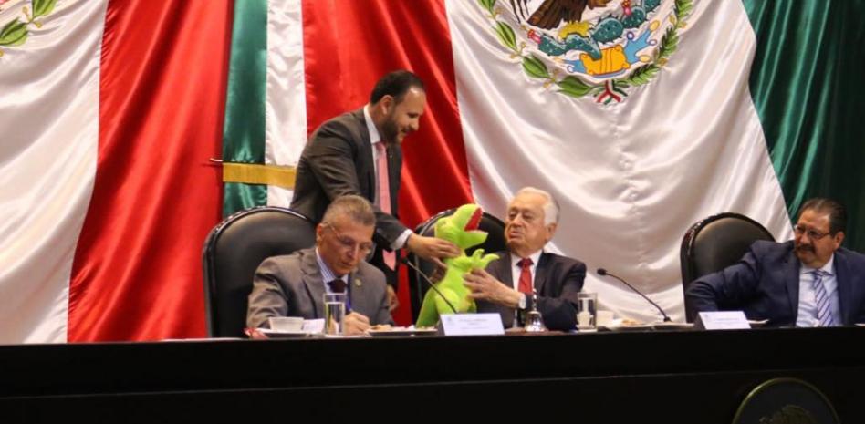 Comparece Manuel Bartlett; le regalan un dinosaurio de peluche y le dicen ‘non grato’
